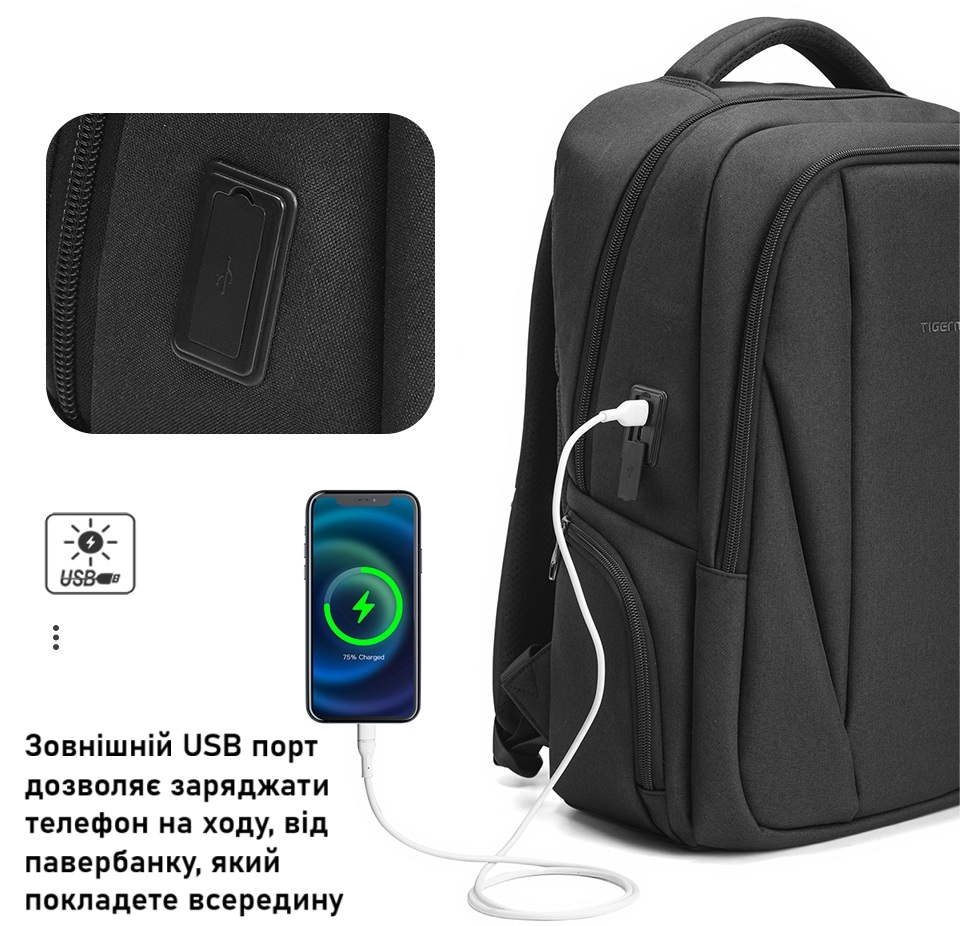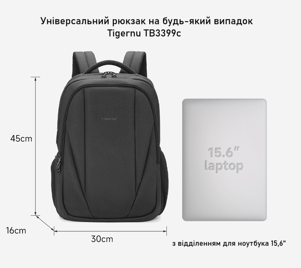 Рюкзак Tigernu T-B3399 - відмінний універсальний помічник, як в якості міського рюкзака, так і в якості ручної поклажі в поїздку або подорож. Матеріал рюкзака - практичний, зносостійкий Оксфорд. Він не вигоряє на сонці, а в парі з внутрішньою підкладкою не дає рюкзаку промокнути під дощем. Всередині є захисна кишеня для ноутбука на 15,6 дюймів.