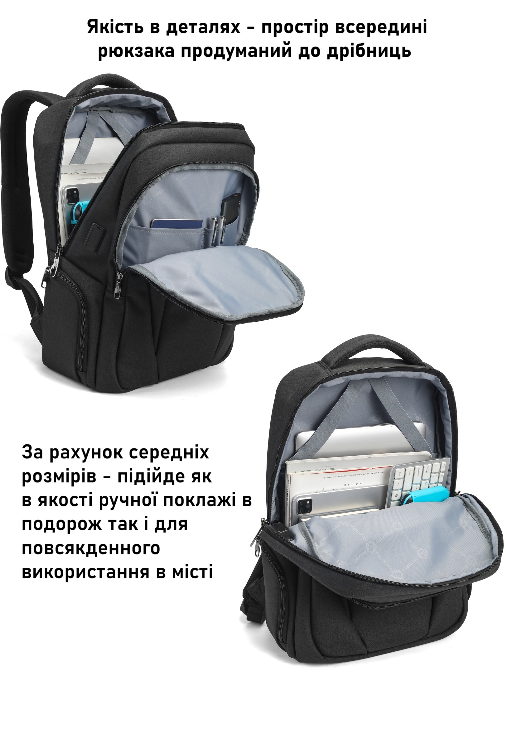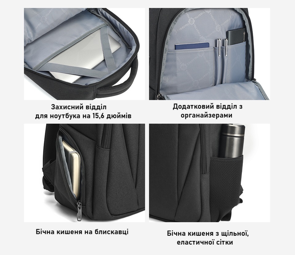 | Структура рюкзака: | Модель T-B3399c складається з: основного відділу з кишенею для планшета і рядом додаткових кишеньок, додаткового відділення з безліччю кишень-органайзерів, двох бічних кишень, (одна на блискавці, друга сітчаста для води або парасольки), вбудованого захисного карману для ноутбука з боковим доступом. |