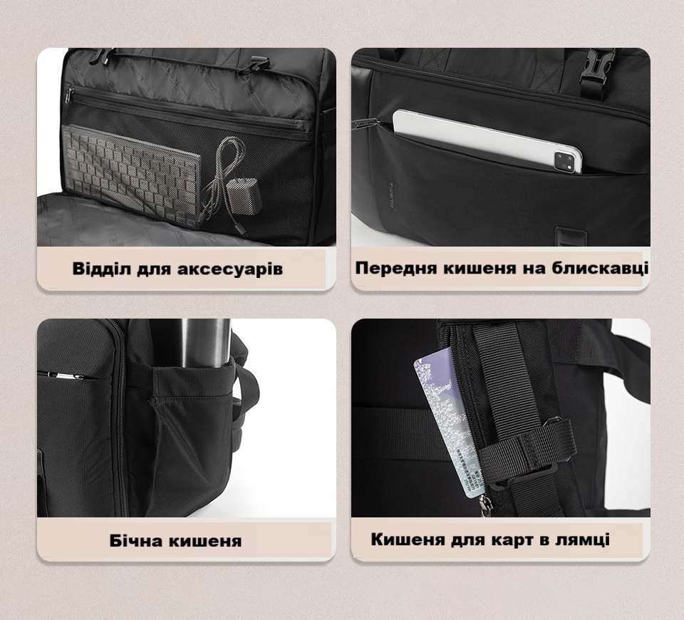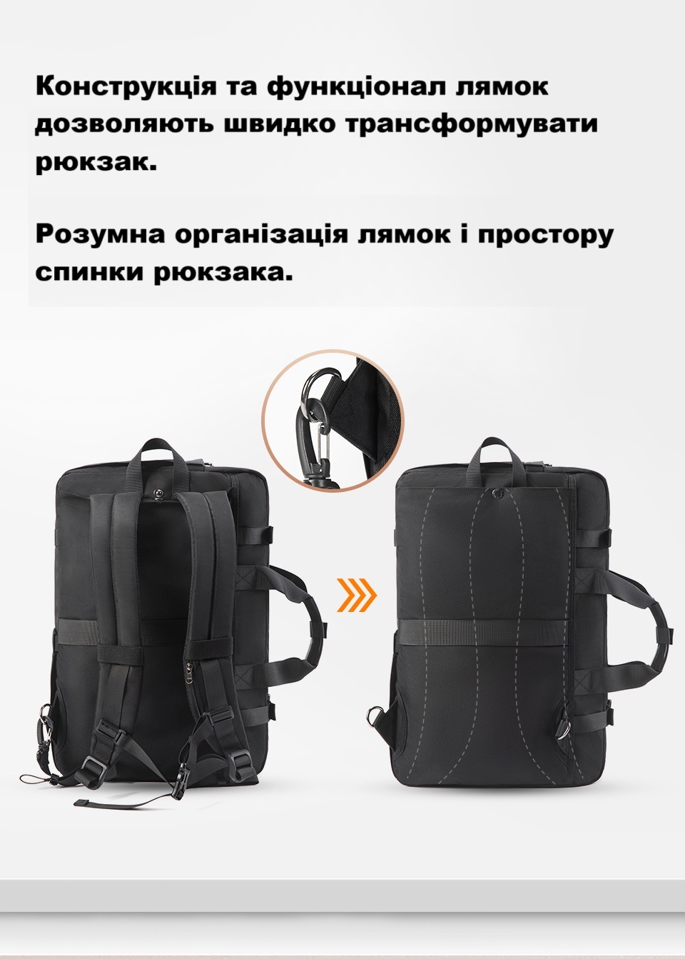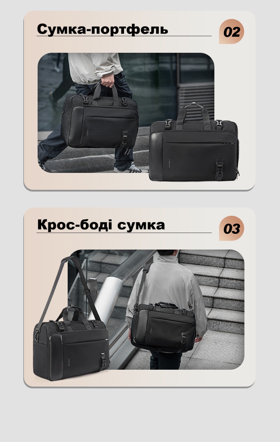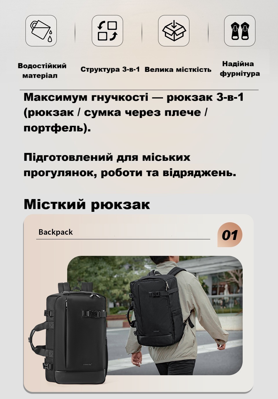 - Форм-фактор 3-в-1: легко трансформується між режимами рюкзак / сумка через плече / кросбоді / ручна сумка — ідеально для відряджень, міського життя та офісу.