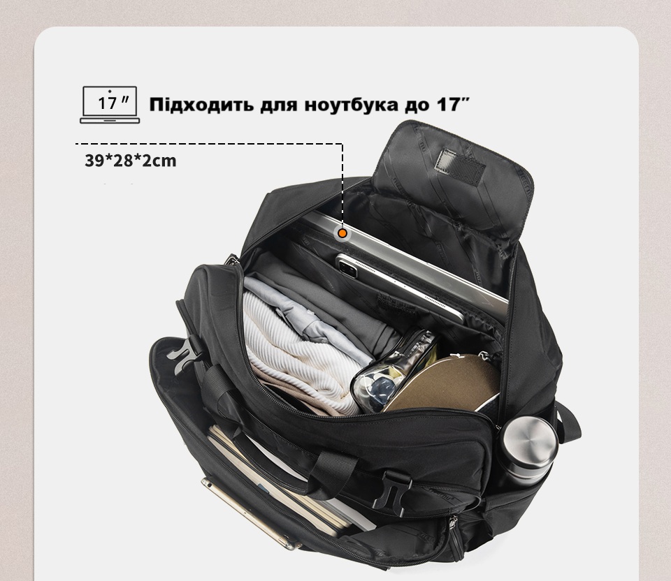 - Матеріал: міцний водовідштовхувальний нейлон 900D — захищає від дощу та надає виробу преміальний вигляд.