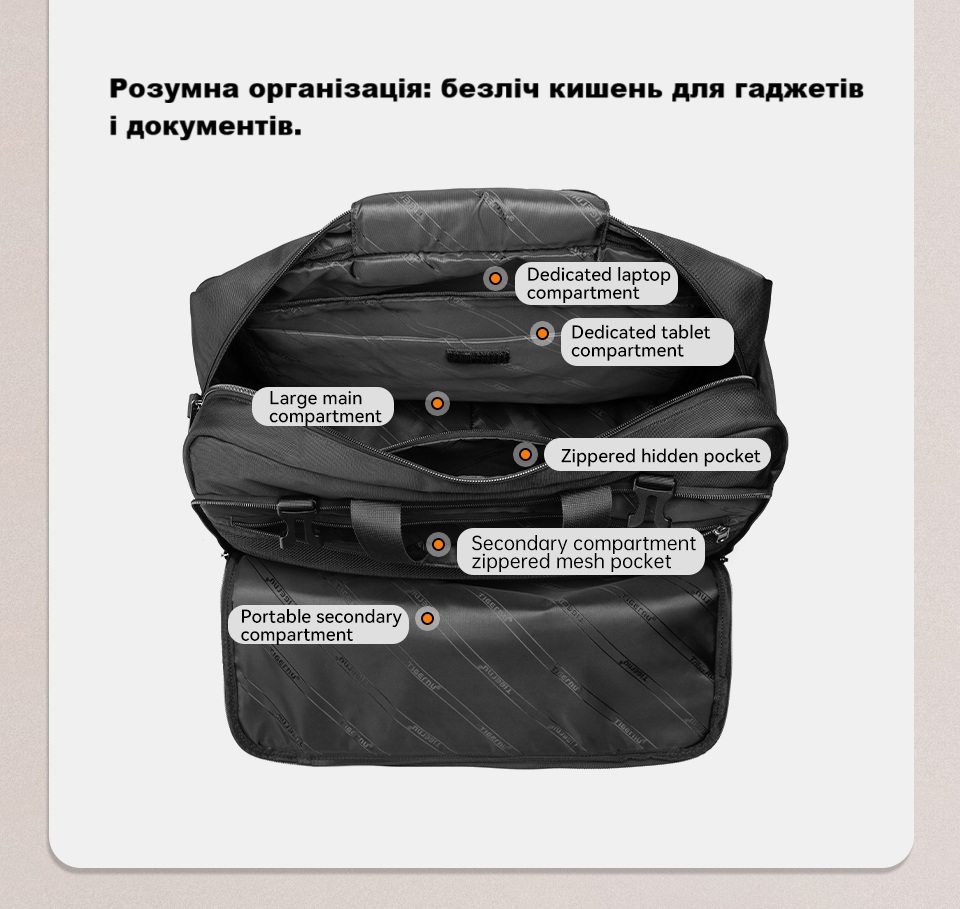 - Кілька відділень: основне відділення для ноутбука, окремий кишеня для планшета чи документів, приховані кишені для цінних речей і аксесуарів.